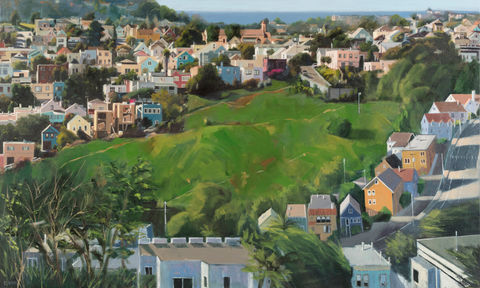 I am often intrigued by partners who paint together. How does one project their vision in concert with another? It is an exercise in trust, and valuing the creativity of each. Suzette and James have made tandem painting one of their trademarks. Sometimes they will each paint the same subject, to be shown side-by-side, while at other times — as in this painting — they will each contribute to the same canvas. I am intrigued not only by the decisions each make in composing the overall whole, but in the daringness they take as a team in portraying some parts in completion, while others are left to our imagination, as if in fleeting visions captured by paparazzi’s cameras.